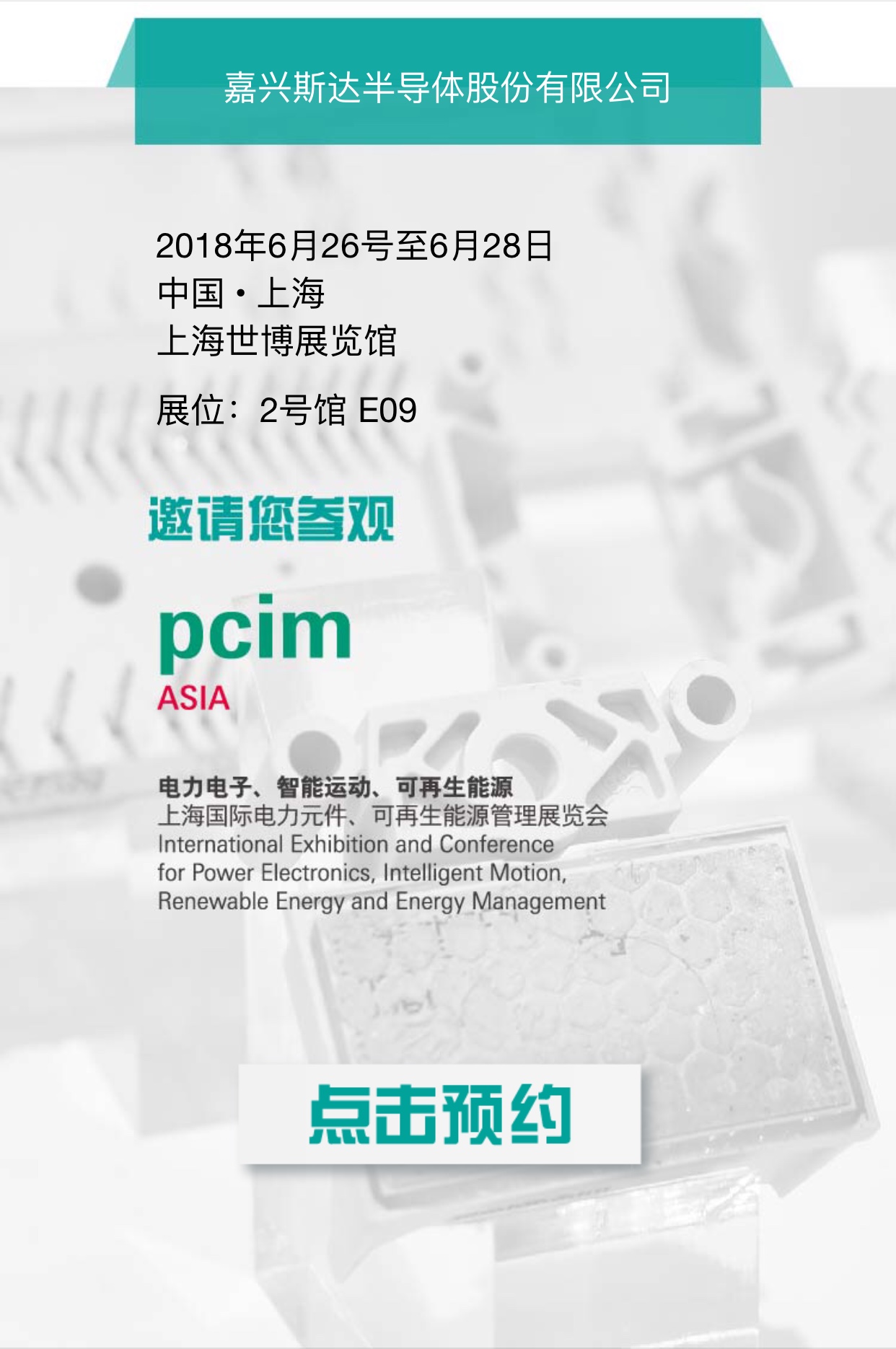 6月26~28日,2018上海国际电力元件、可再生能源管理展览会(PCIM ASIA)将在上海世博展览馆举办,嘉兴AG旗舰厅半导体股份有限公司诚邀您莅临2号馆E09展位参观指导。